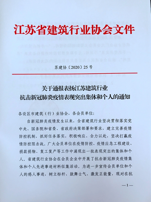 6月1日,江蘇省建筑行業協會發布《關于通報表揚江蘇省建筑行業協會抗擊新冠肺炎疫情表現突出集體和個人的通知》,對協會內抗擊疫情成績突出先進單位和個人予以通報表彰。在此次表彰中,鈺翔控股集團榮獲江蘇省建筑行業協會“抗擊新冠肺炎疫情表現突出集體”榮譽稱號。